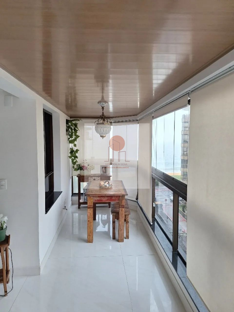 A varanda integrada à sala, com vista para o mar, cria um ambiente amplo, acolhedor e perfeito para momentos simples que fazem diferença: um café pela manhã, conversas ao fim do dia,