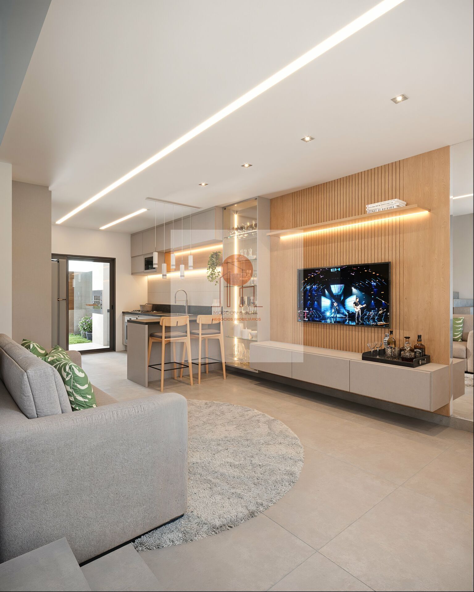 Sala de estar, jantar e cozinha em conceito integrado